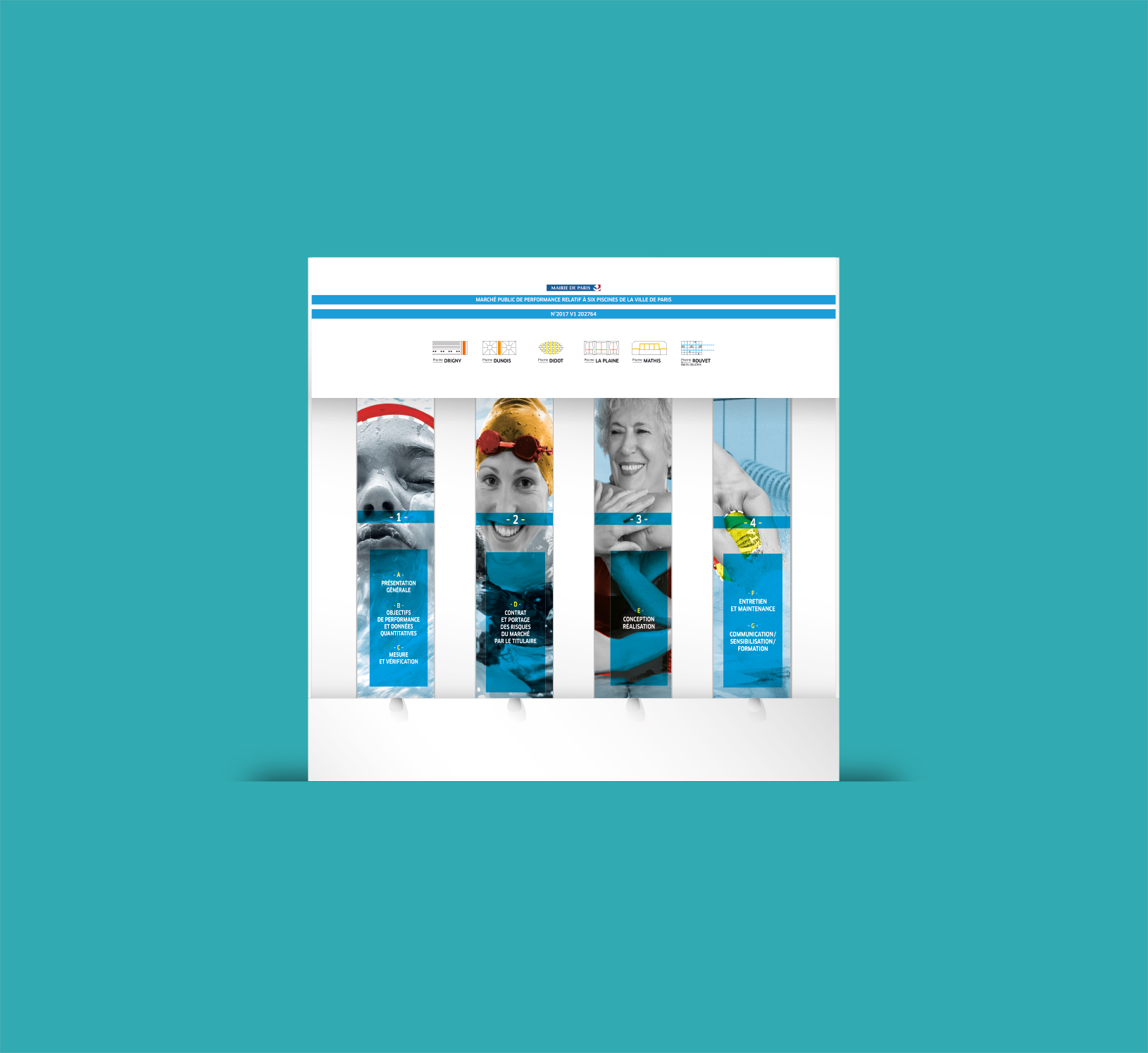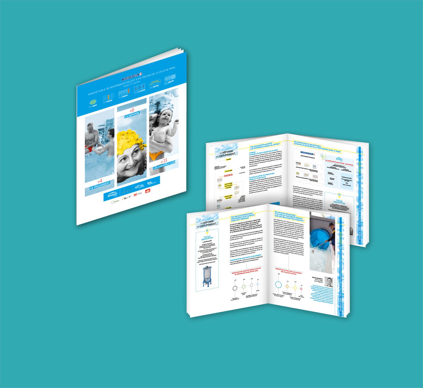énergétique de 6 piscines. Un packaging complet de l’offre a été réalisé : boîtes, classeurs, éléments bureautiques et synthèse. Un traitement graphique moderne et dynamique a été pensé. Il met en avant l’attachement au bâti et à l’humain et plonge la ville de Paris dans la promesse d’Engie Cofely : une modernisation des équipements pour garantir le confort et la qualité du bien-être des utilisateurs.