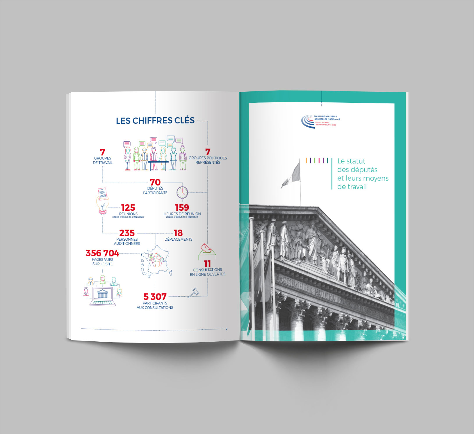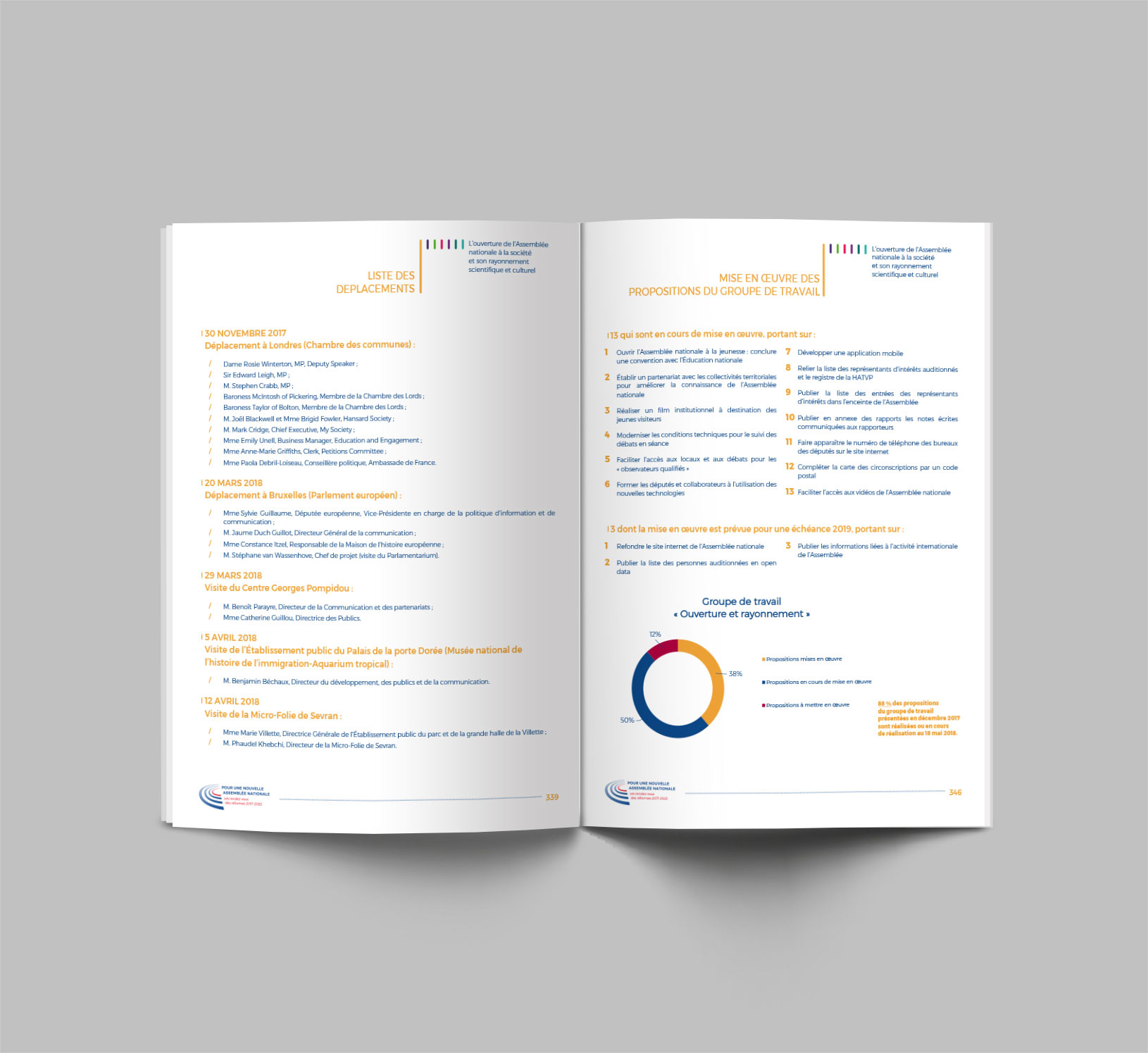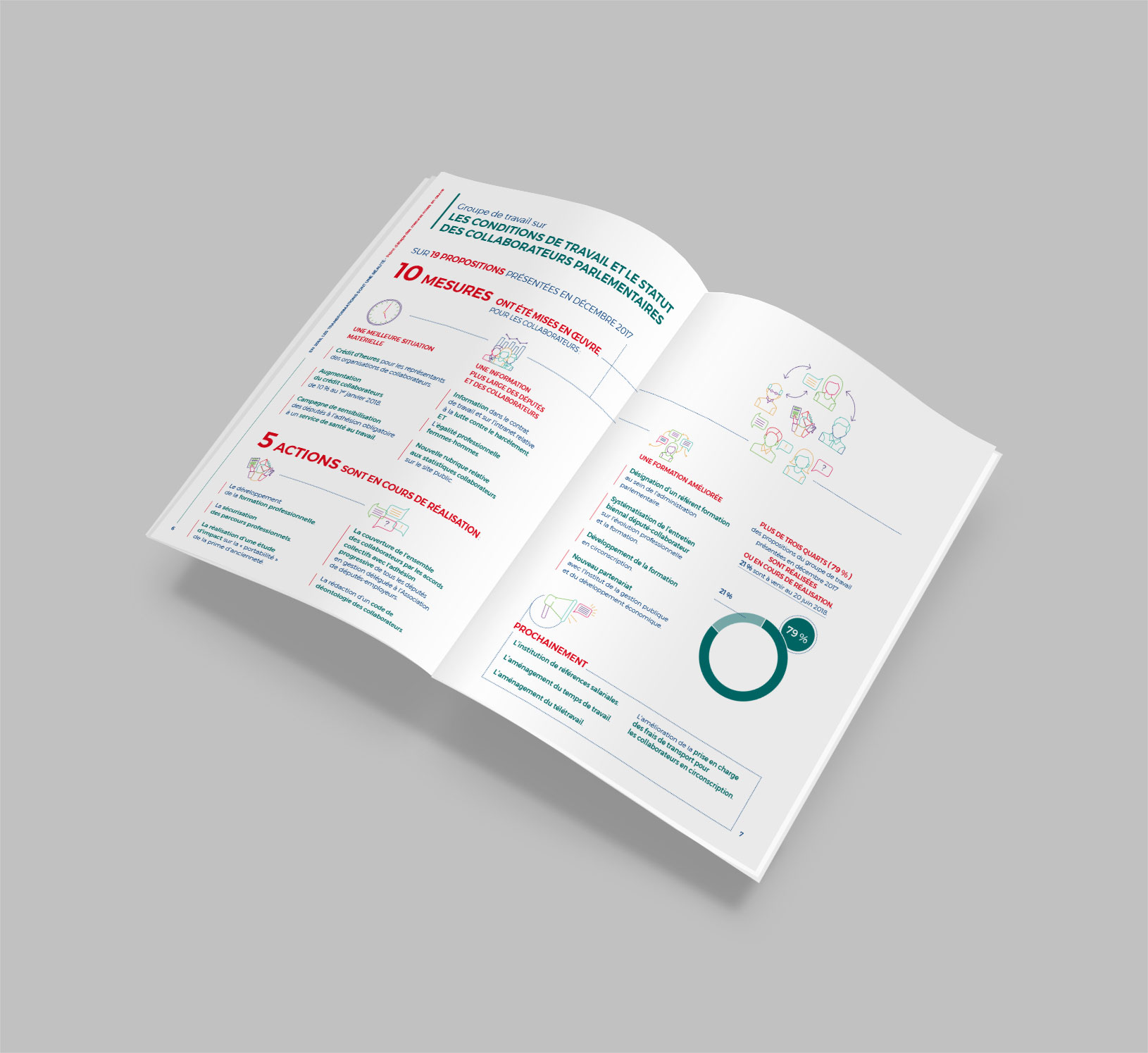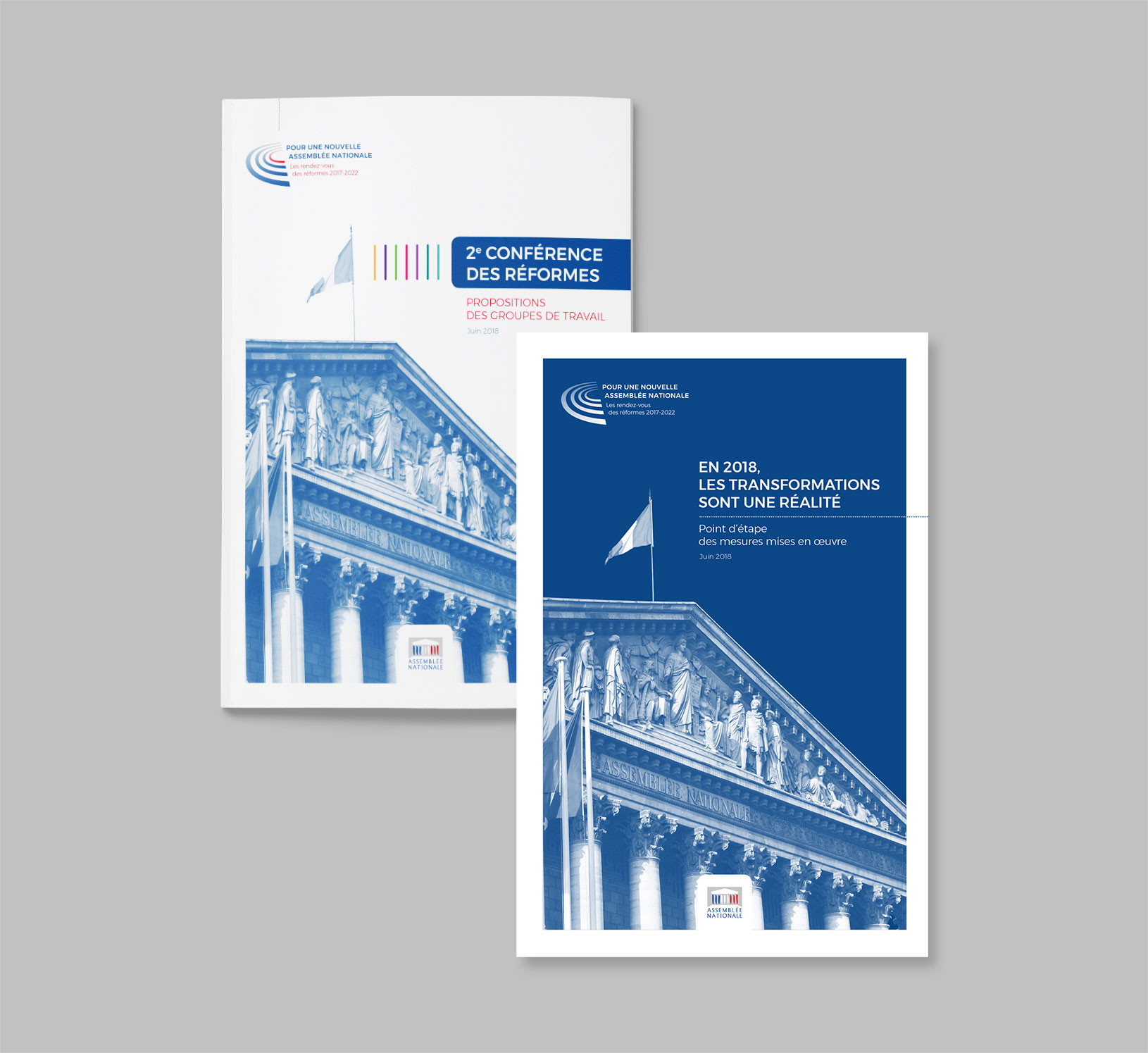 Afin de permettre à l’Assemblée nationale de communiquer sur l’avancée des réformes, Bathyscaphe a également élaboré un masque Word à la charte facilitant la mise en page par l’institution d’un contenu de près de 350 pages. Enfin une brochure synthétique illustrée au design moderne et élégant a été conçue pour permettre à chacun de trouver les informations essentielles sur l’état d’avancement de cet ambitieux chantier.