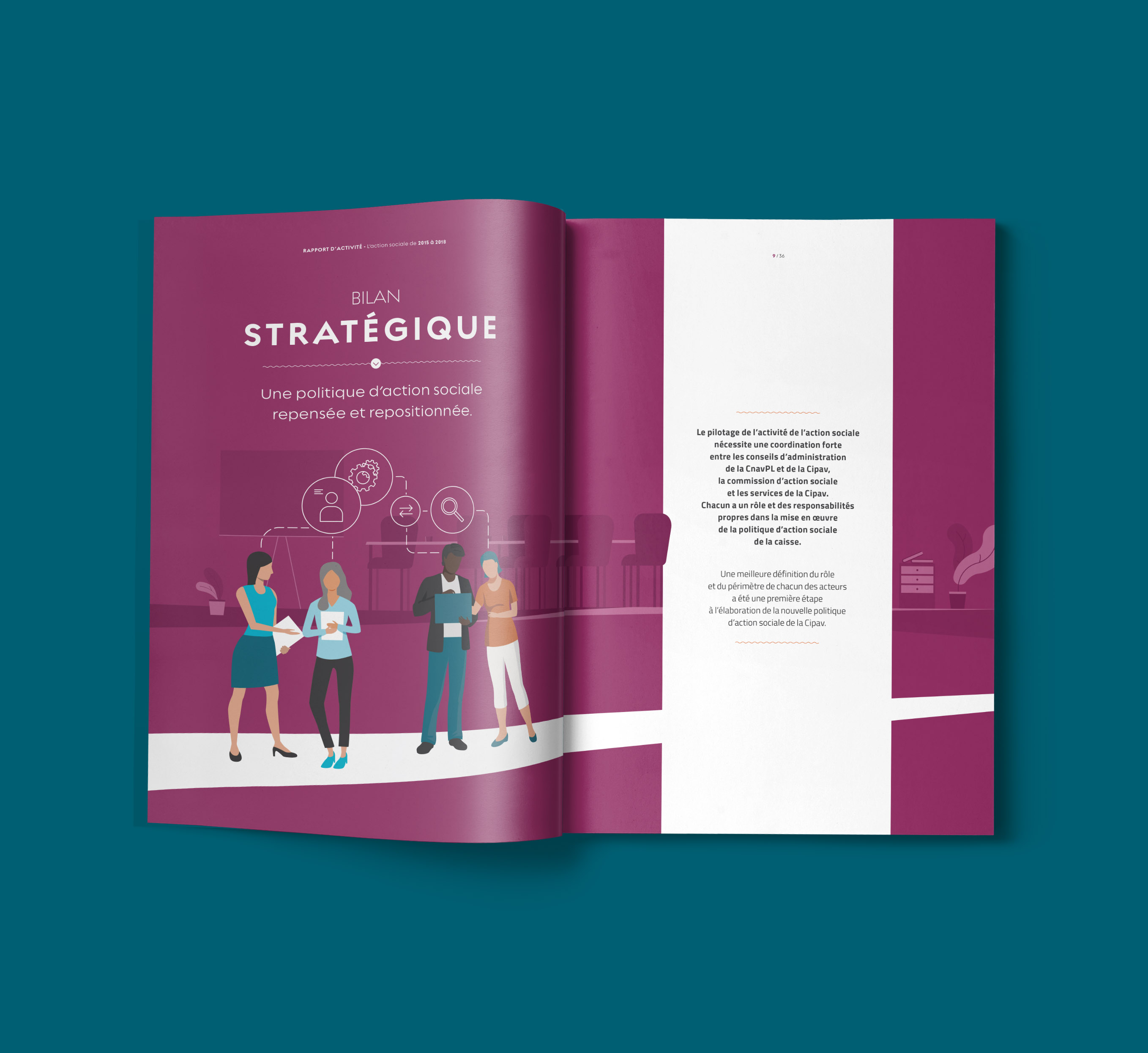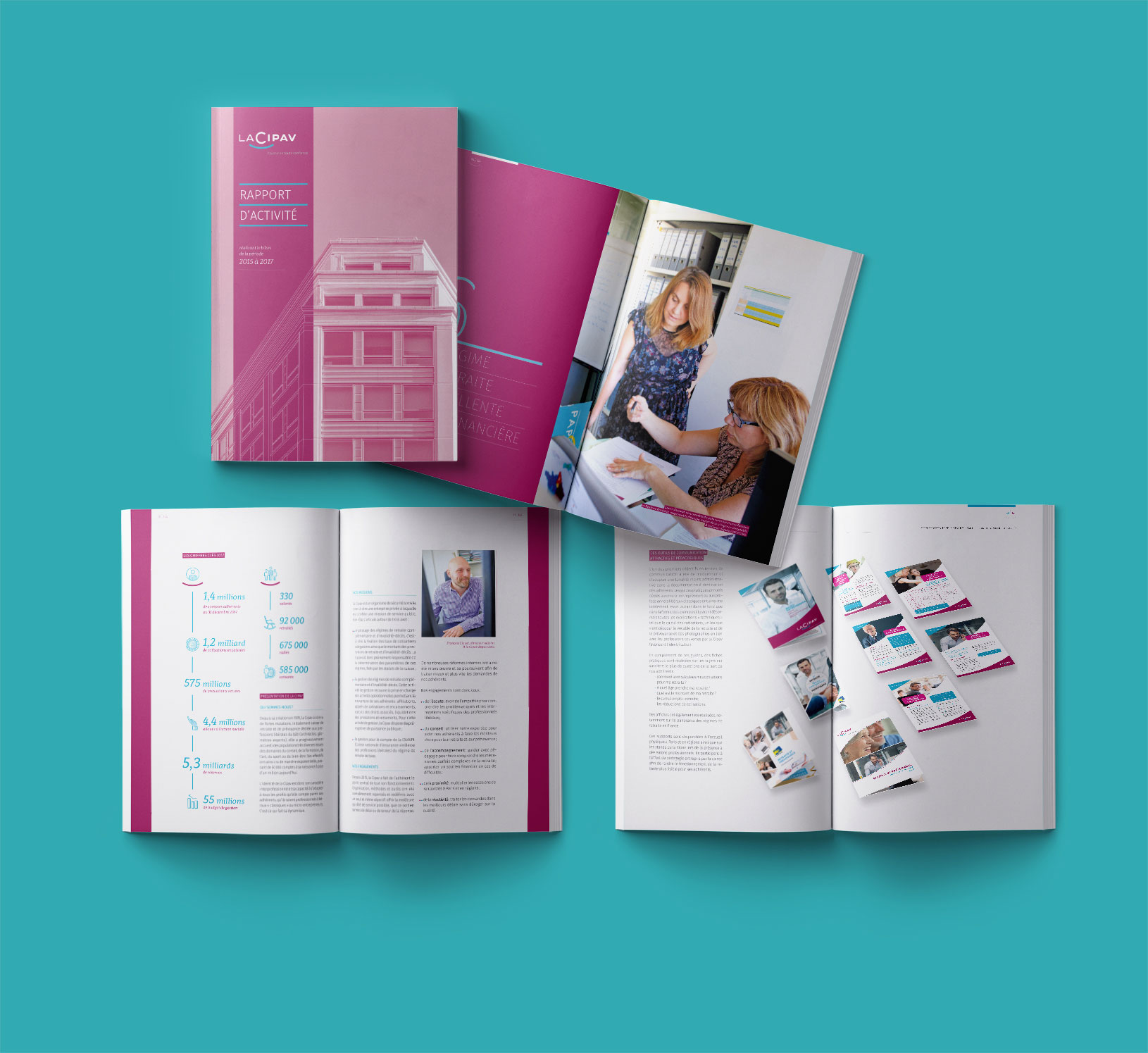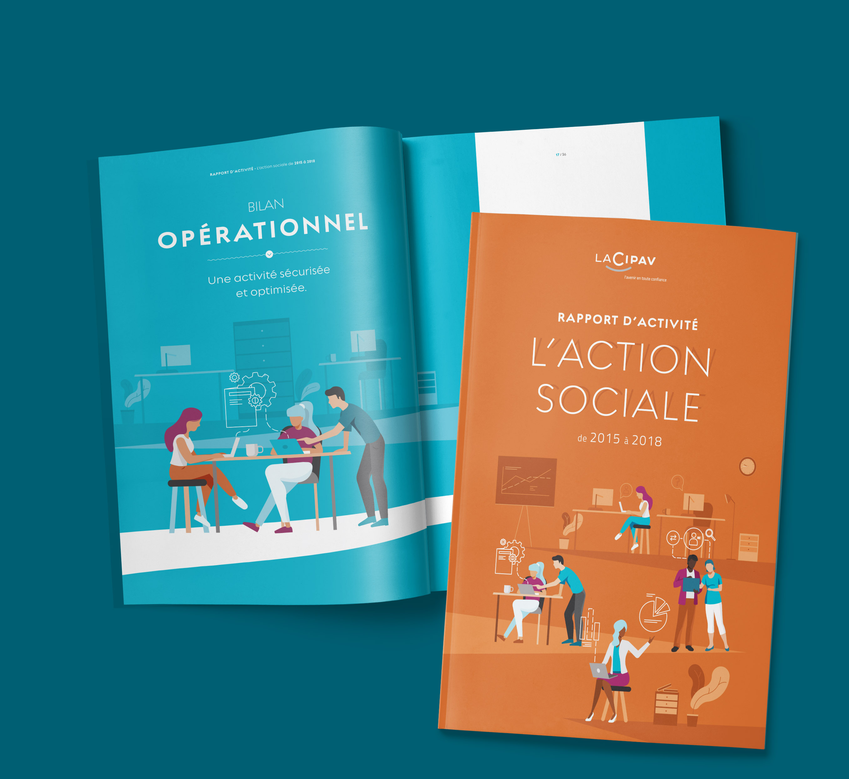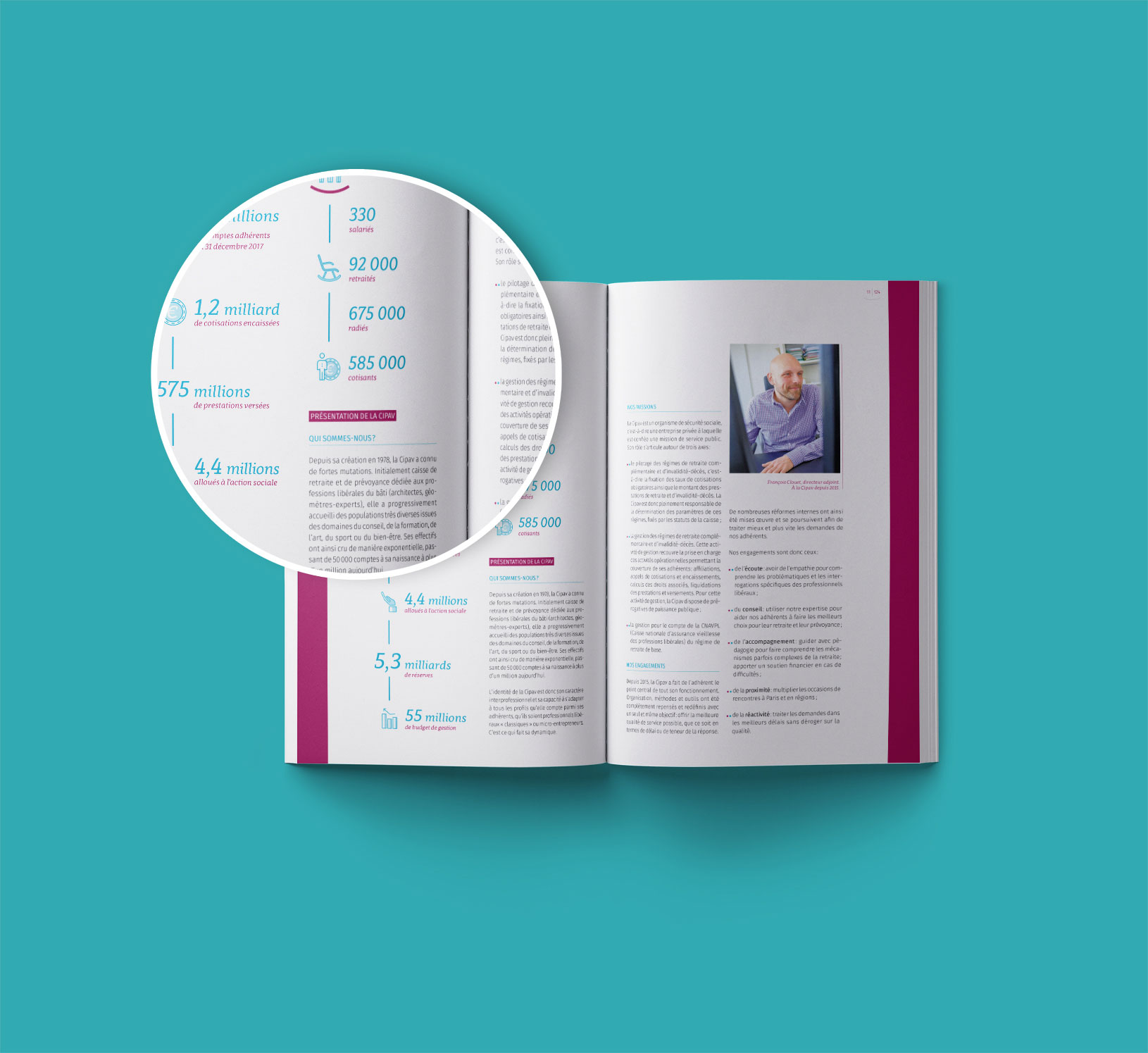 Pour le rapport global, en seulement 10 jours, l’agence a proposé et stabilisé une création et s’est attelé à la mise en pages du rapport. Aux couleurs de la Cipav, cet outil mêle contenus de fond, témoignages de collaborateurs, photographies, graphiques et infographies. C’est grâce à ce support que la Cipav entend bien démontrer comment, en trois ans, chaque salarié a contribué au rayonnement de l’entreprise !