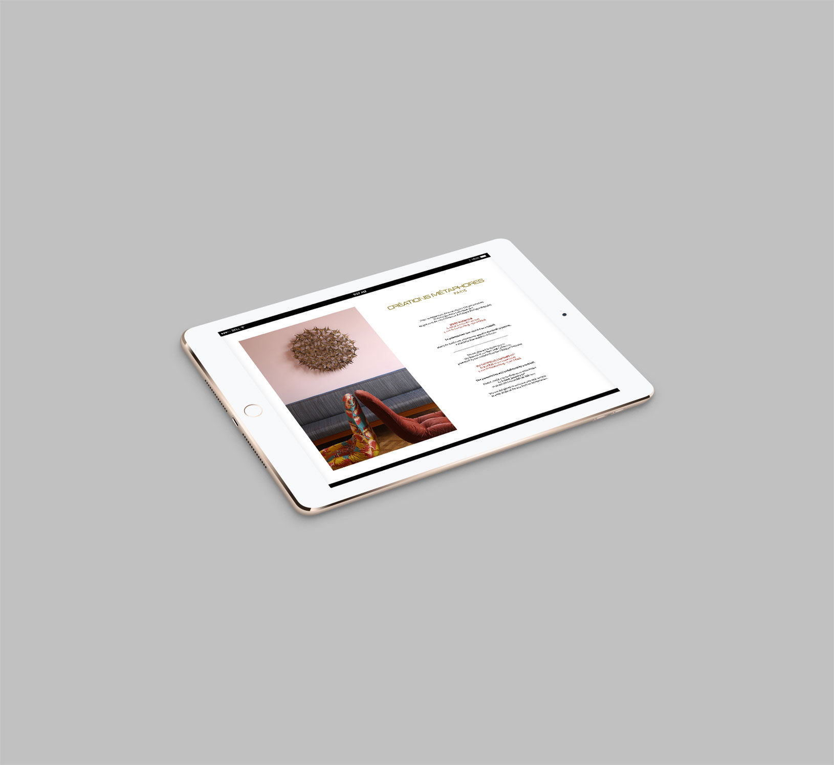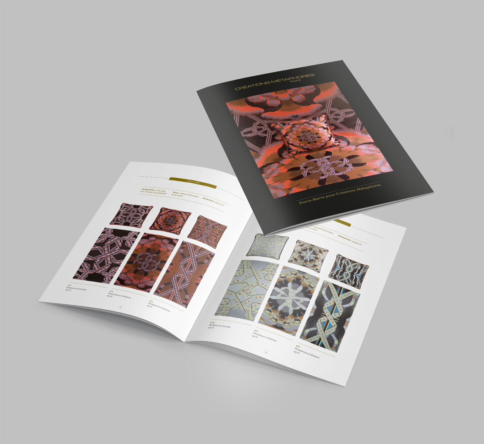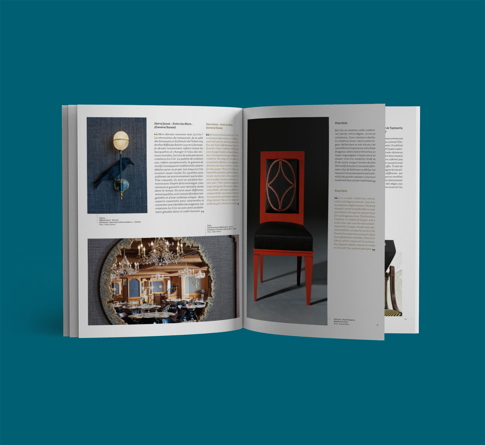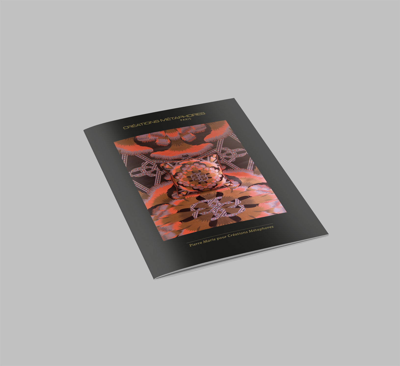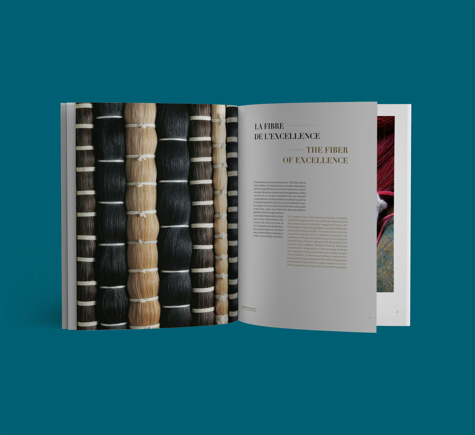 Créations Métaphores met en lumière sa marque Le Crin. Bathyscaphe a donc travaillé sur un book de présentation en imaginant un chemin de fer original mettant en exergue ce savoir-faire ancestral. La création mêle habilement contemporain et luxe, exigence et beauté. Des touches de doré, de grandes photos pleine page et une mise en page aérée viennent sublimer cette matière d’exception.