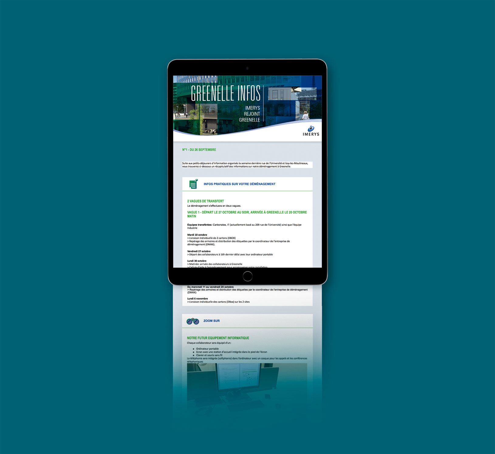 Fort de son développement, Imerys réorganise l’implantation de ses équipes situées en IDF, pour regrouper l’ensemble des services au sein d’un même immeuble HQE et BBC dans le quartier de Beaugrenelle. L’annonce de ce déménagement est accompagnée d’un plan de communication orchestré par Bathyscaphe.