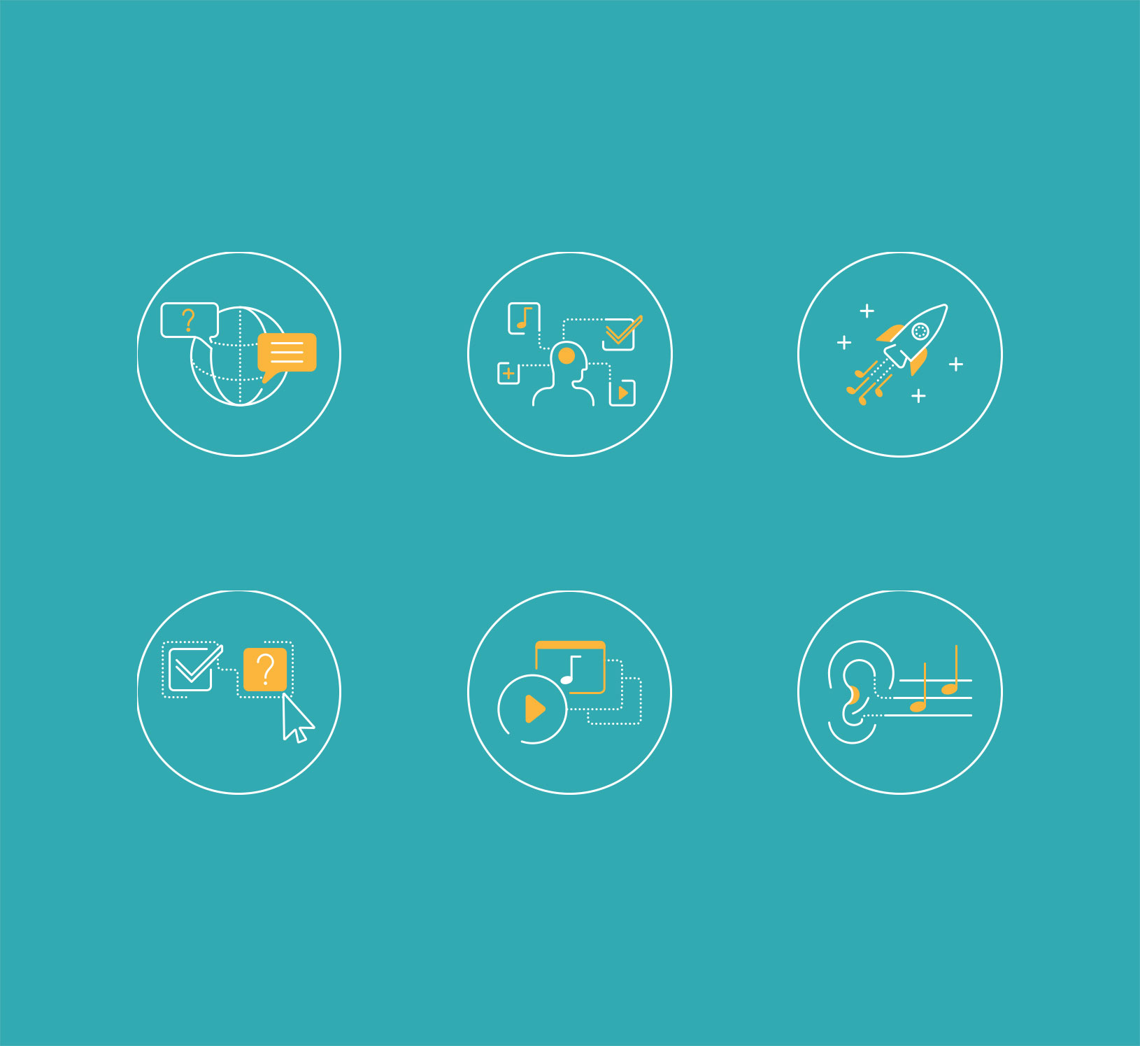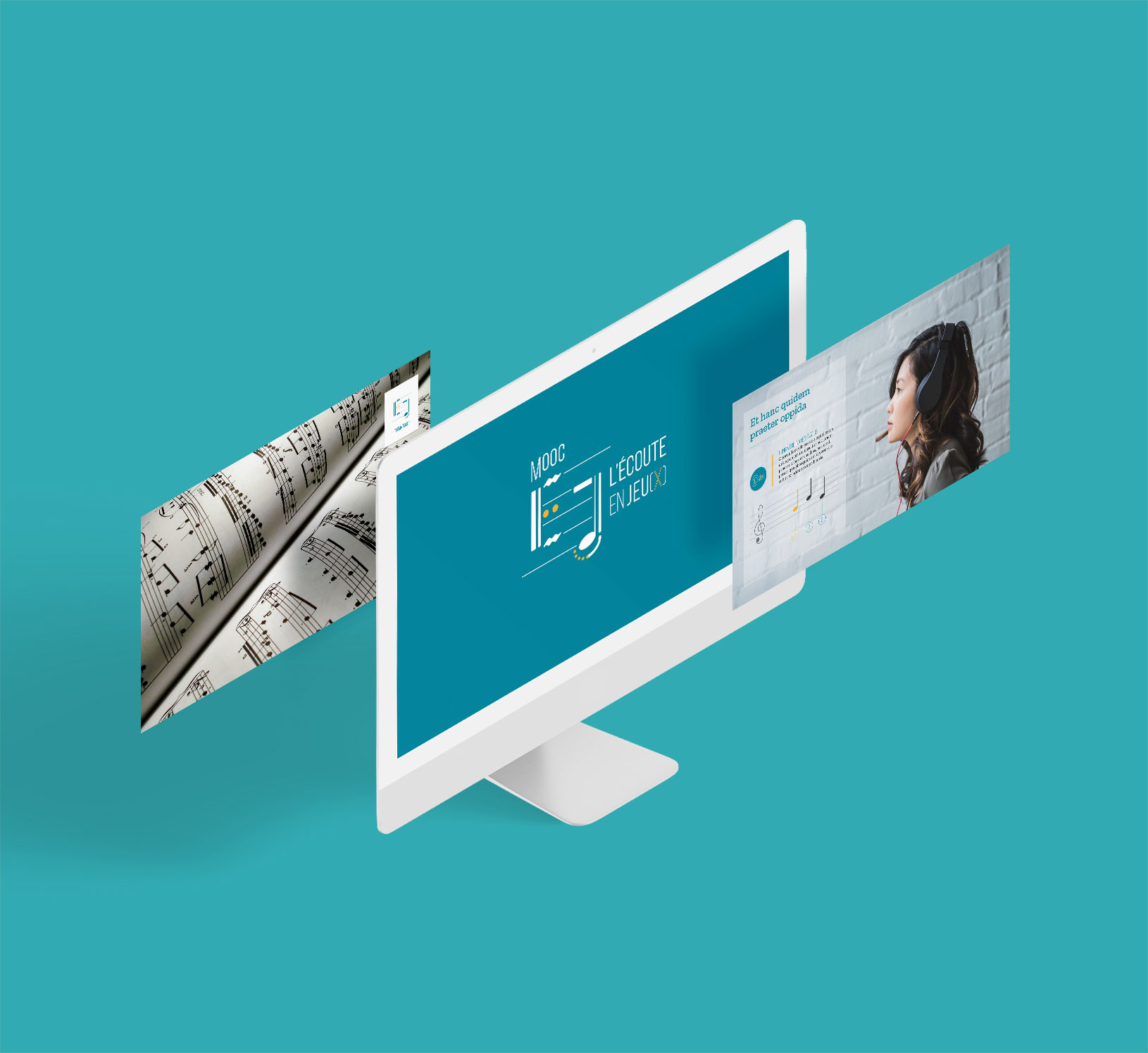 Bathyscaphe entre dans la danse en créant l’identité graphique du MOOC et sa charte graphique. Une construction imaginée en portée stylisée pour que cette identité matérialise les messages du MOOC : la musique vous écoute autant que vous la touchez.