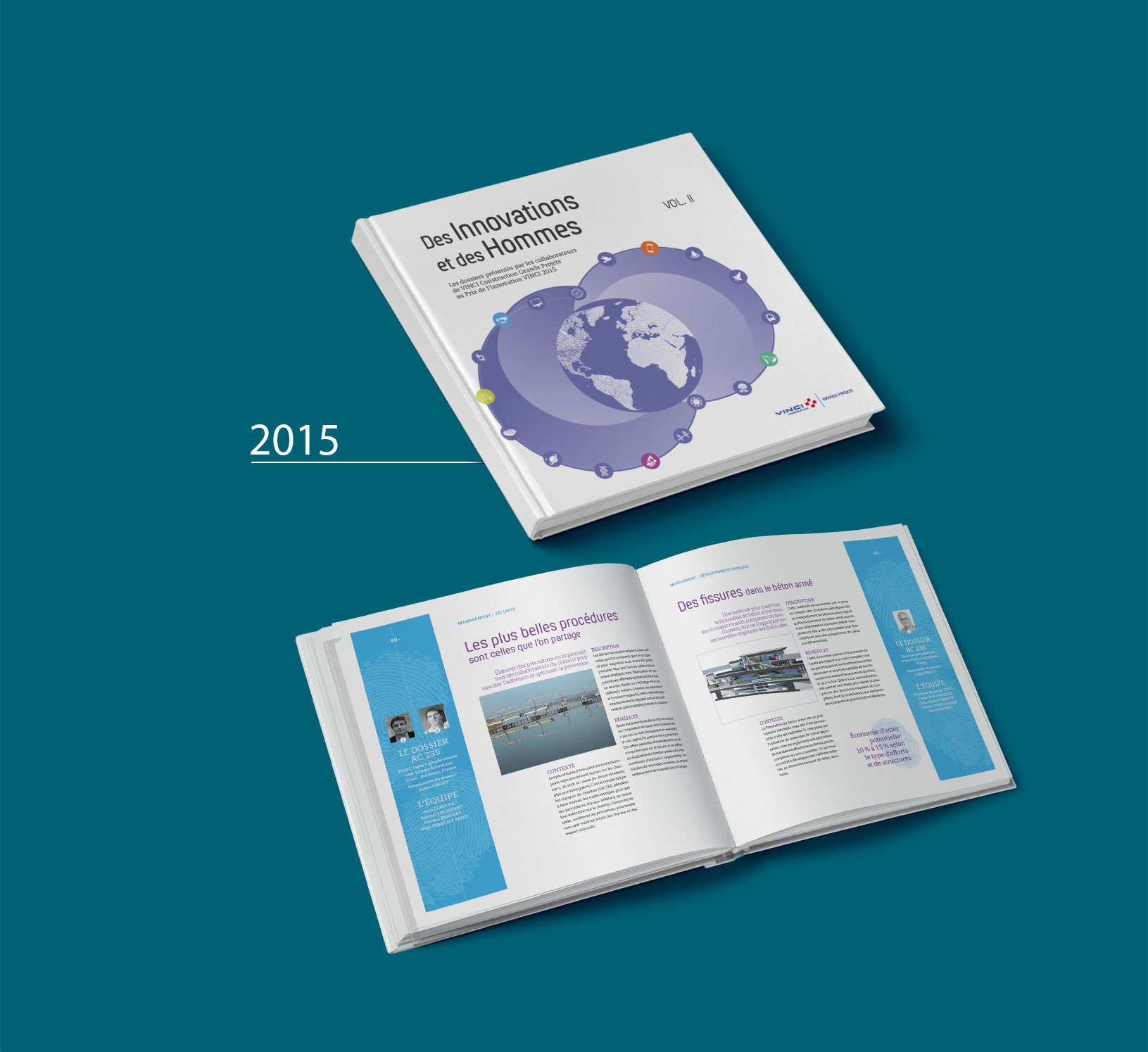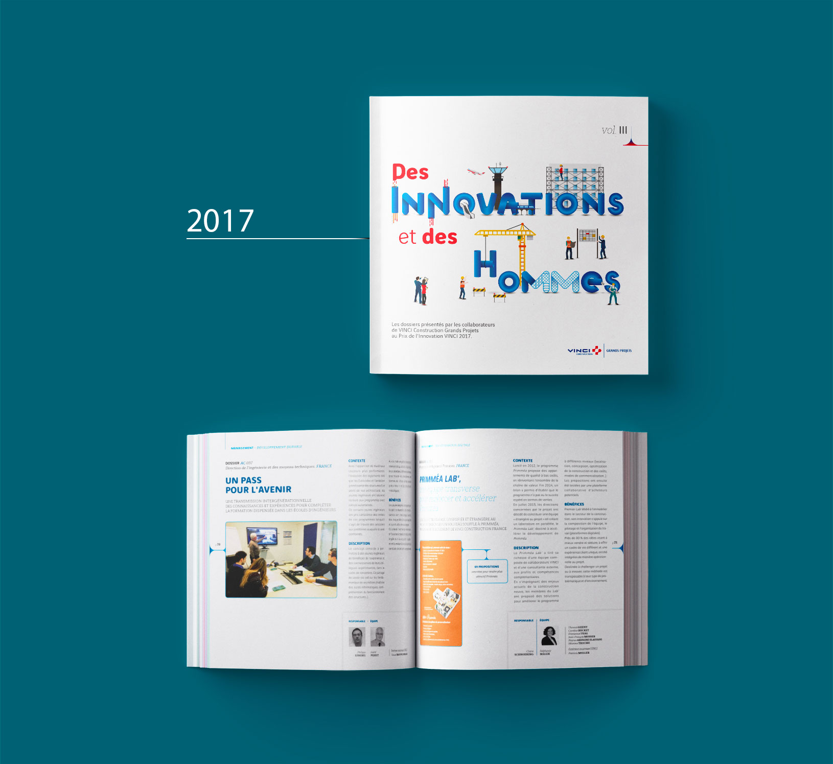 Vinci Construction Grands Projets a incité chacun de ses collaborateurs à se voir, l’espace d’un jour, concepteur et force de proposition. Tous les projets innovants qui en découlent se compilent dans un livre à usage interne, dont Bathyscaphe s’est vu confier la conception du principe éditorial et l’impression en 2015 et 2017.