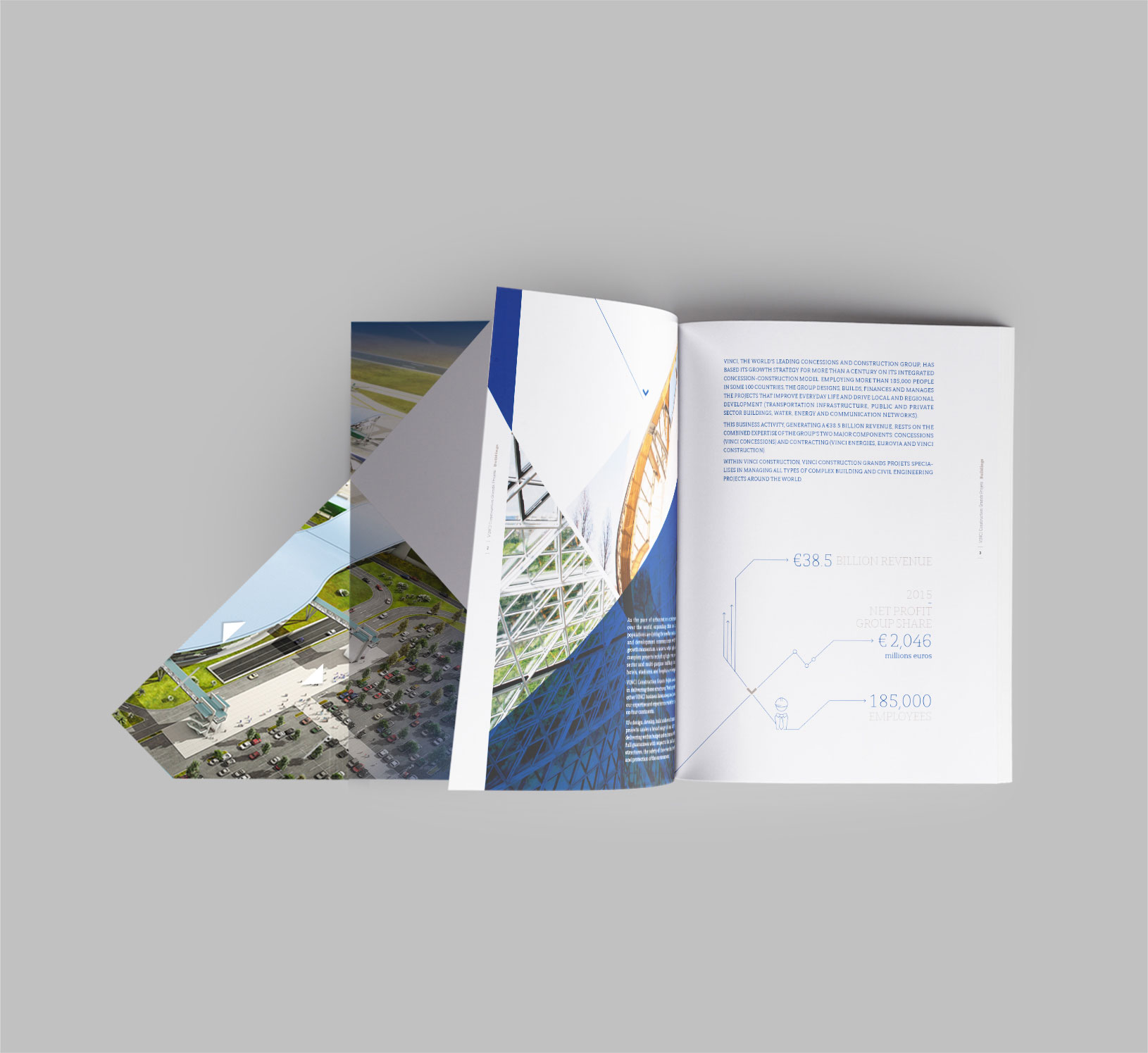 L’ouvrage reste la star et la fabrication finit de sublimer l’œuvre. Au final une brochure « commerciale » percutante, qui permet aux projets de VINCI… de s’exprimer d’eux-mêmes.