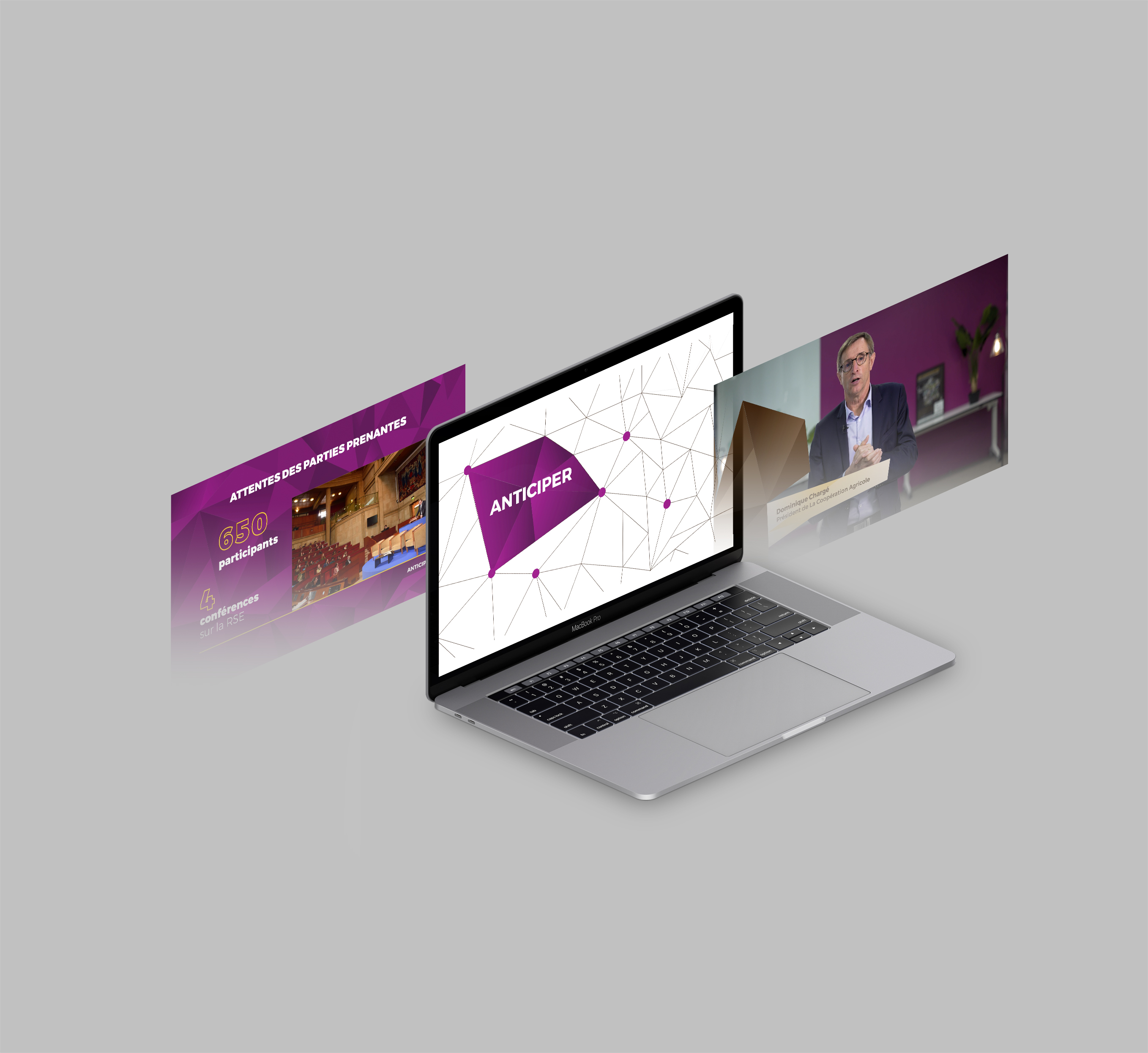 La direction générale souhaite promouvoir ses actions pour mettre en lumière les collaborateurs et les actions qu’ils ont imaginés. L’agence propose une structuration éditoriale d’un portfolio digital afin d’organiser les contenus, elle imagine un univers graphique inspirée du globe pour présenter les actions RSE engagées par les collaborateurs