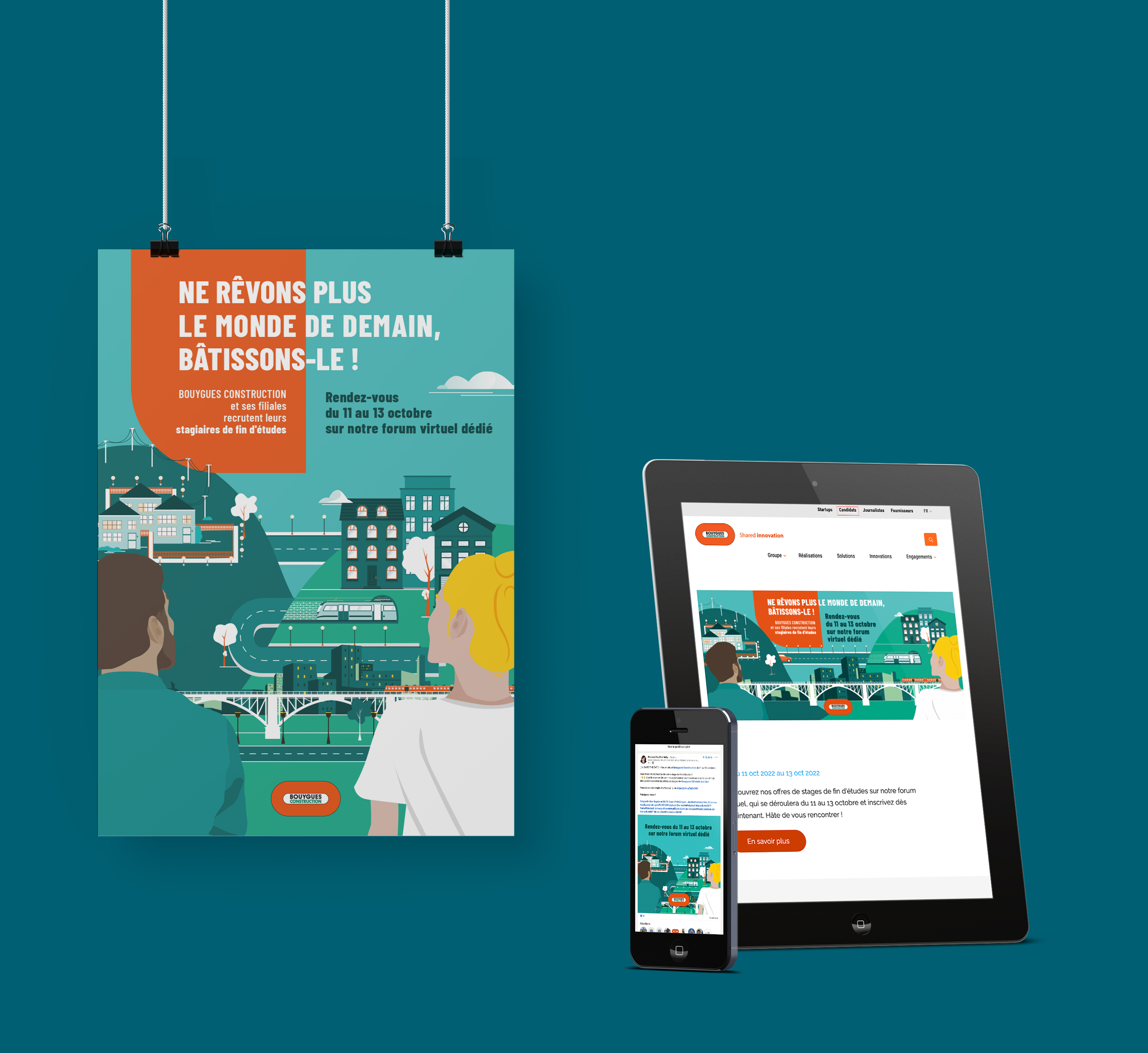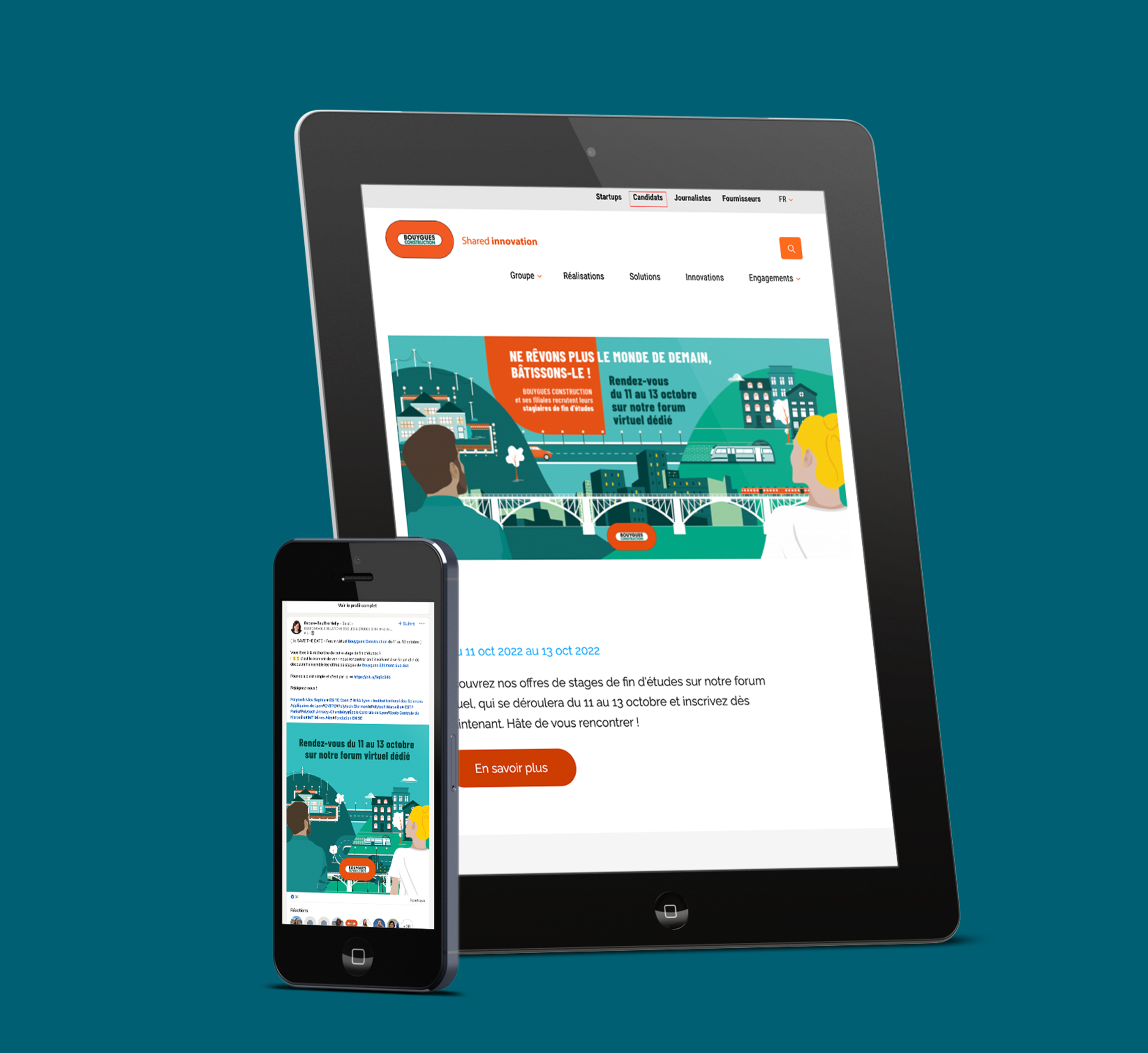 Les équipes de l’agence accompagnent alors le service RH dans la réalisation d’un visuel de promotion d’un forum virtuel organisé par Bouygues Construction et ses filiales.