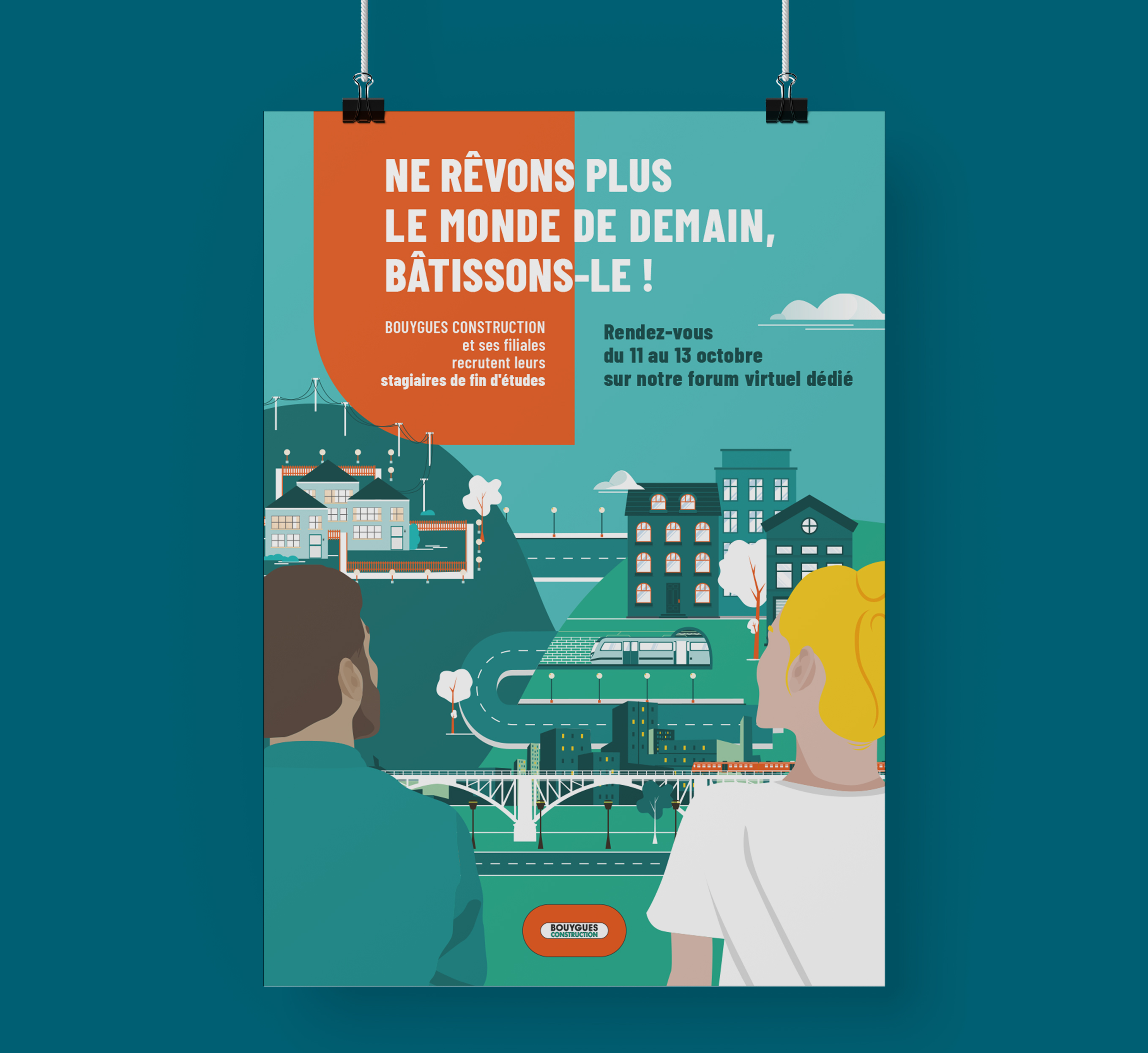 L’agence réalise la conception-création de la campagne en misant sur les ambitions des jeunes recrues et leurs envies de construire un monde meilleur. Une accroche forte et singulière est alors proposée, accompagnée d’une composition illustrée représentant le monde de demain à travers les ouvrages réalisés par Bouygues Construction !